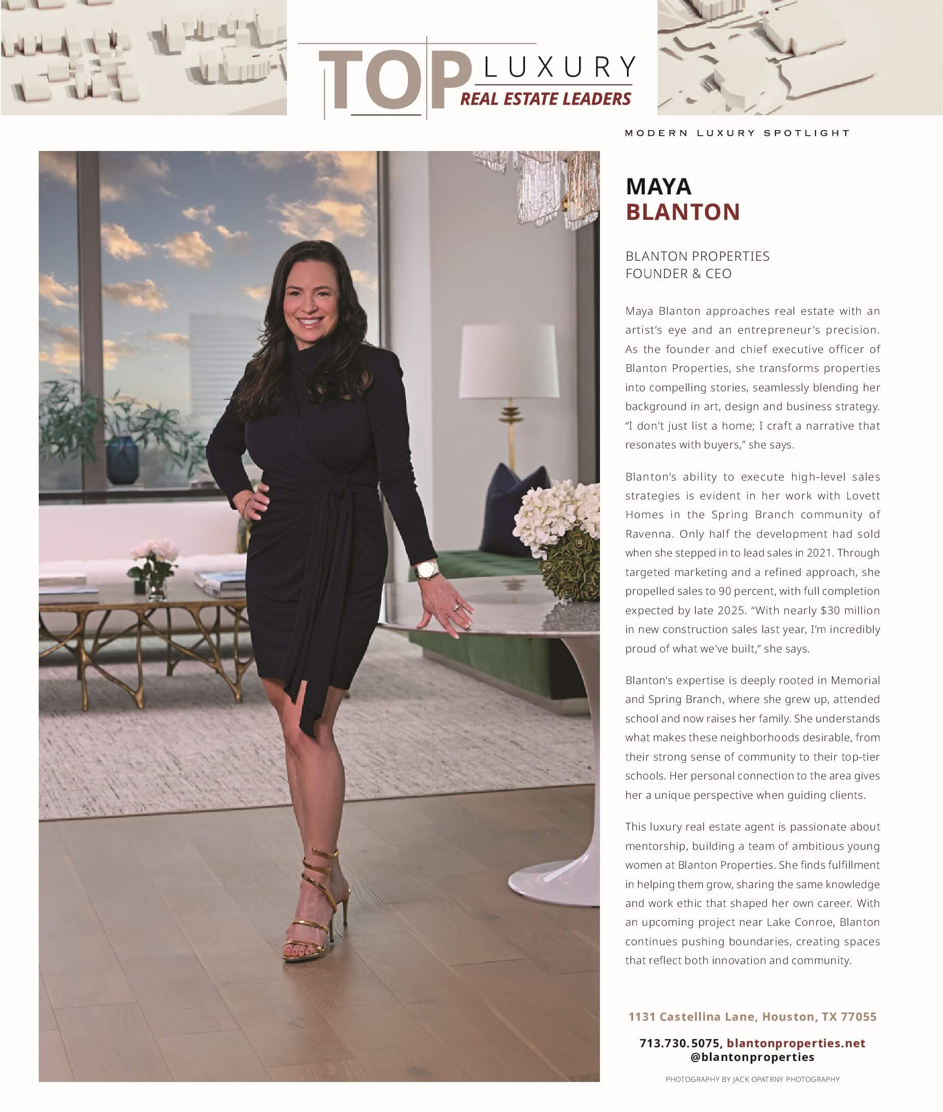 We’re thrilled to share that Maya Blanton, Founder & CEO of Blanton Properties, is featured in the March 2025 edition of Houston Luxury Magazine! The article highlights her expertise in residential real estate sales, her $30M+ success in new construction, and her impact on Houston’s luxury market and beyond.