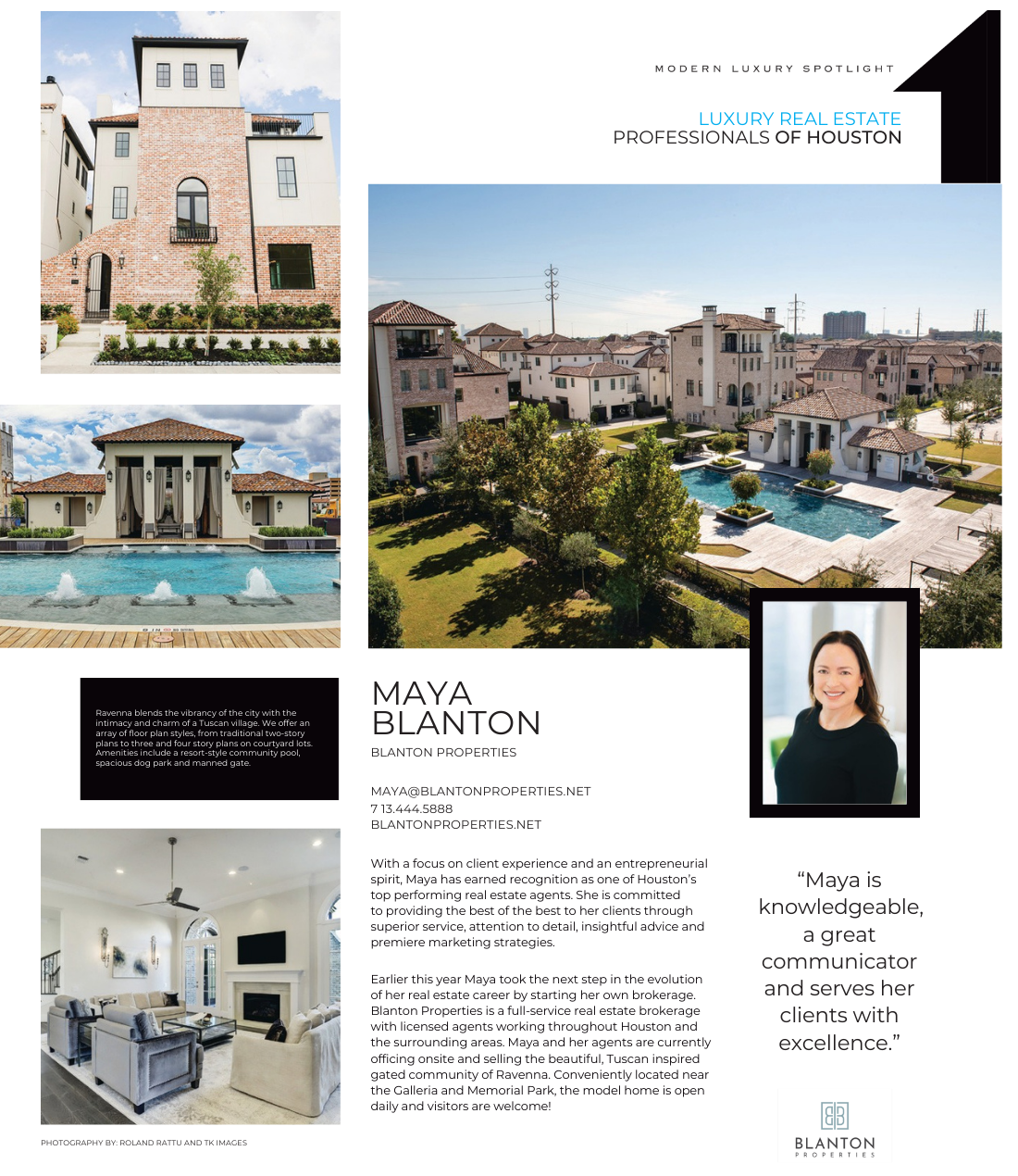 We’re excited to share that Maya Blanton and Blanton Properties were featured in Houston Modern Luxury Magazine! The article highlighted Maya’s dedication to client service, her expertise in Houston’s luxury real estate market, and her work with the stunning gated community of Ravenna.